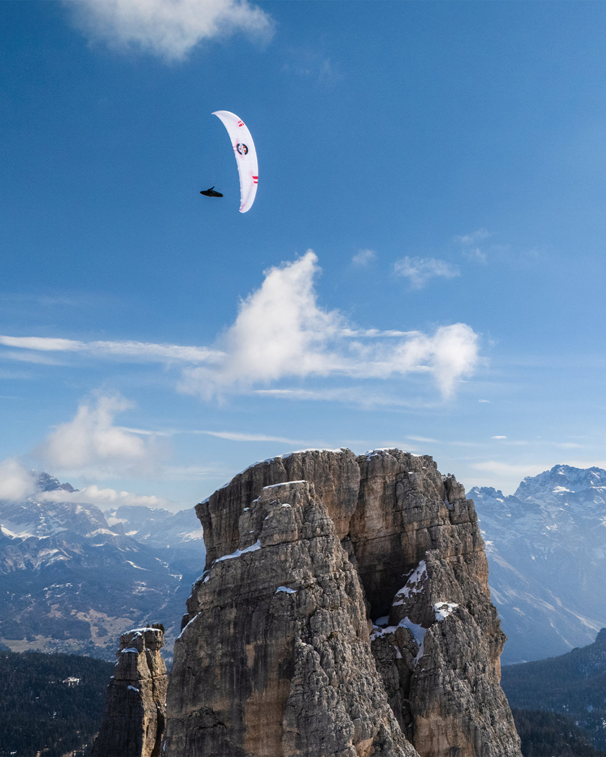 Francois Montuori soars above the Dolomites beneath a boundless blue sky — IT’S A VUARNET DAY. Freedom takes shape in flight. Limitless, weightless and alive with adventure.