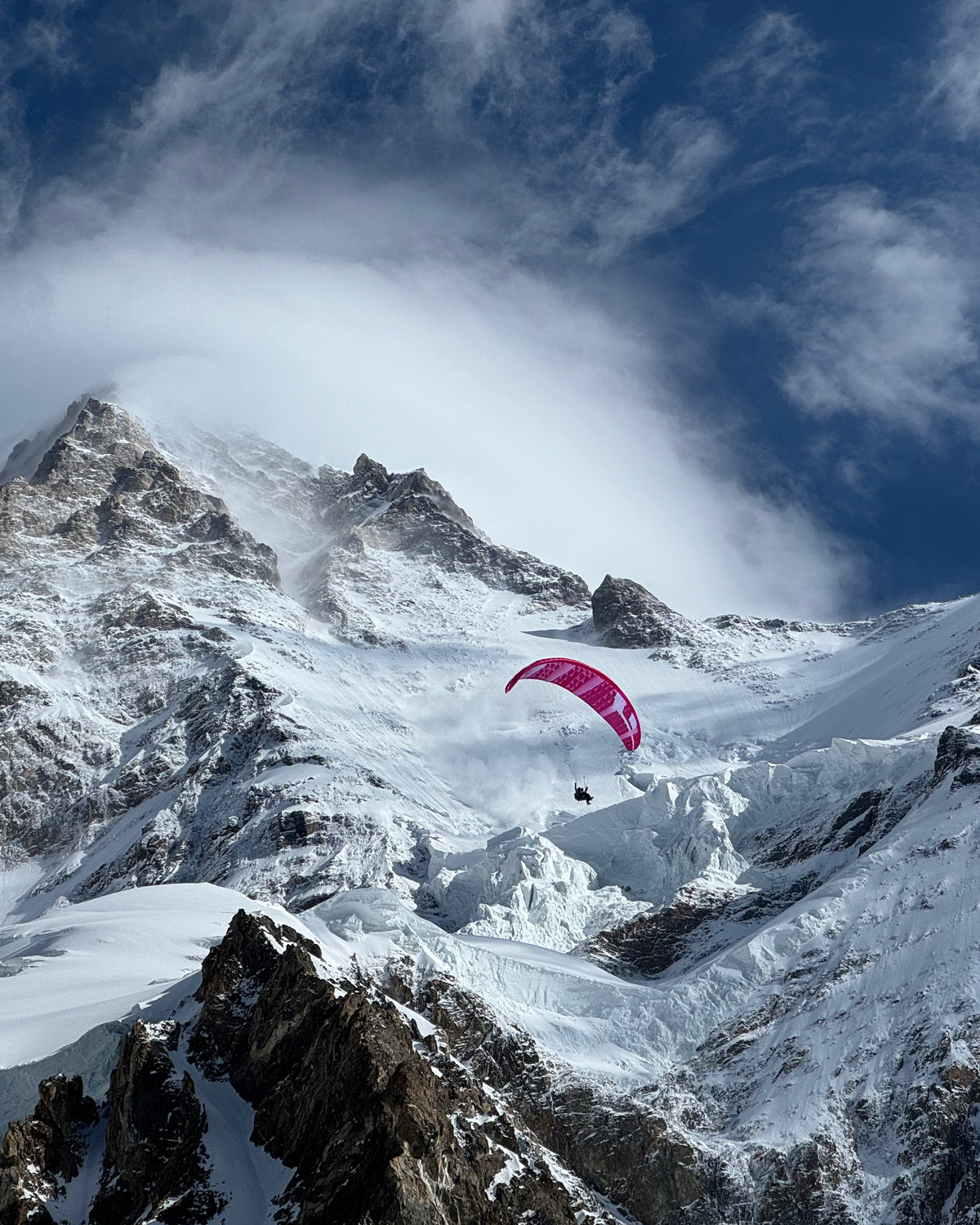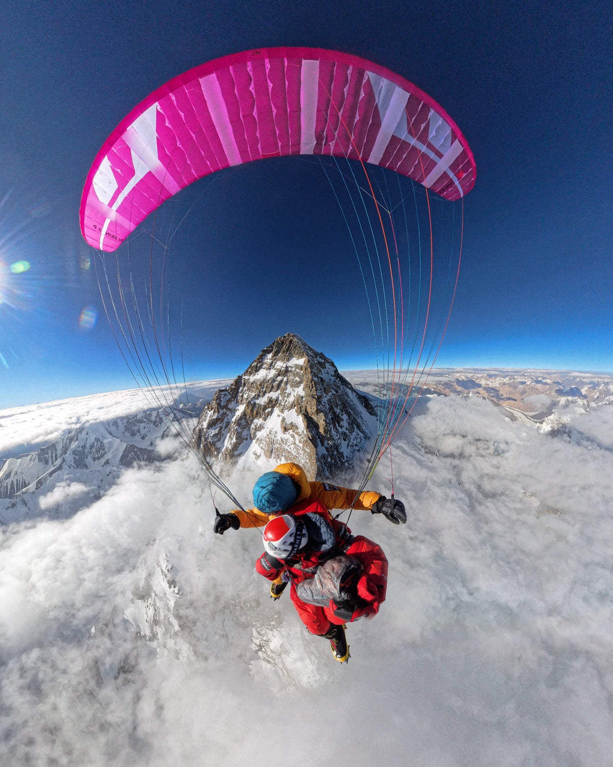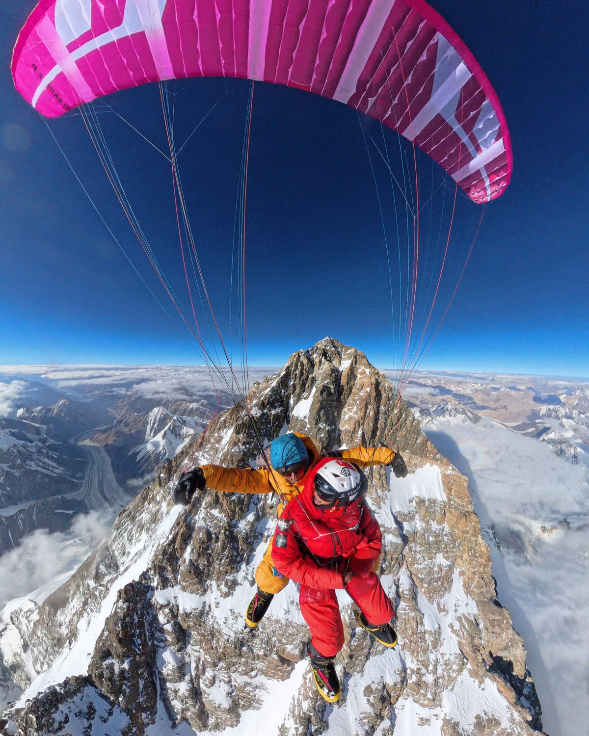 Malgré la durée de l'effort et la fatigue liée au manque d'oxygène, ils ont eu la chance d'atteindre le sommet avec juste ce qu'il leur fallait de vent pour décoller en biplace.