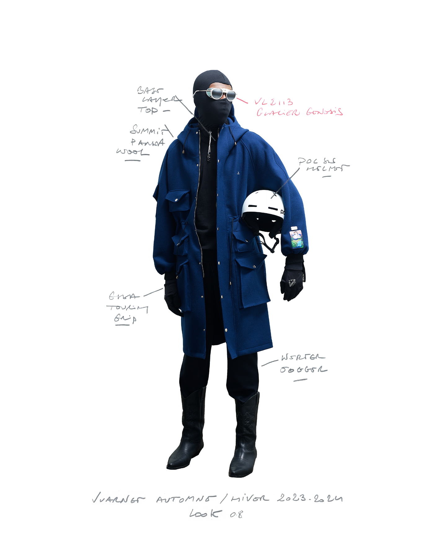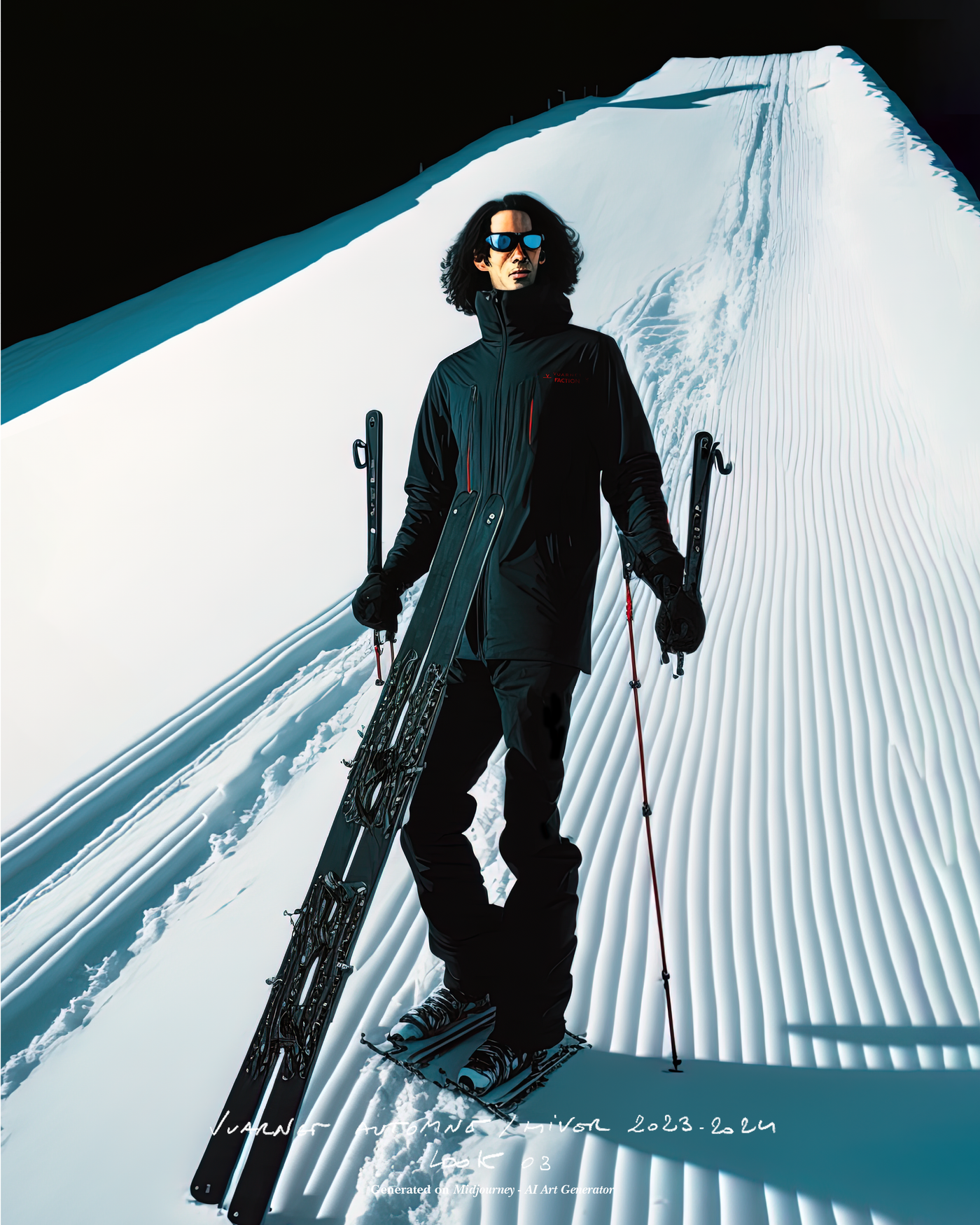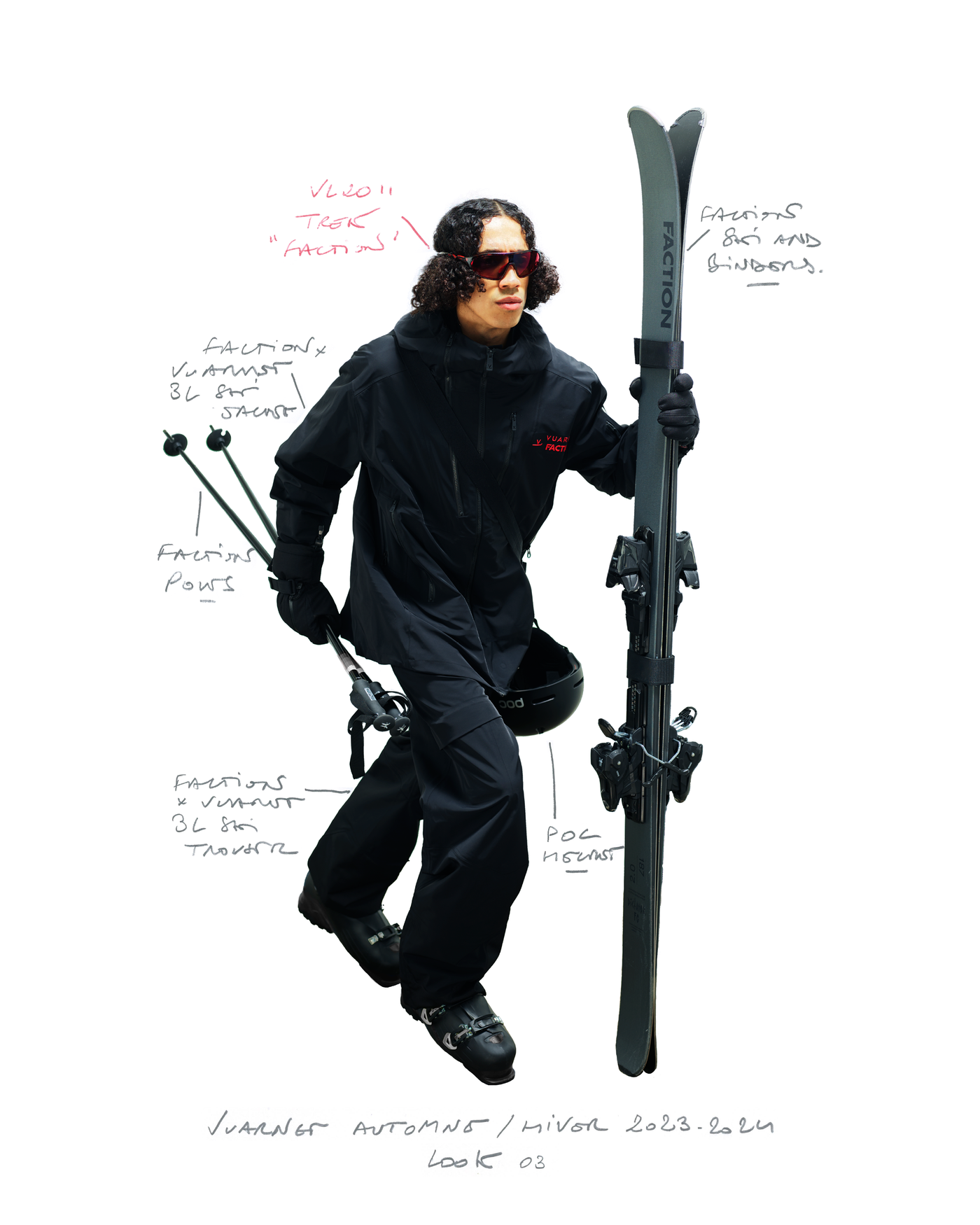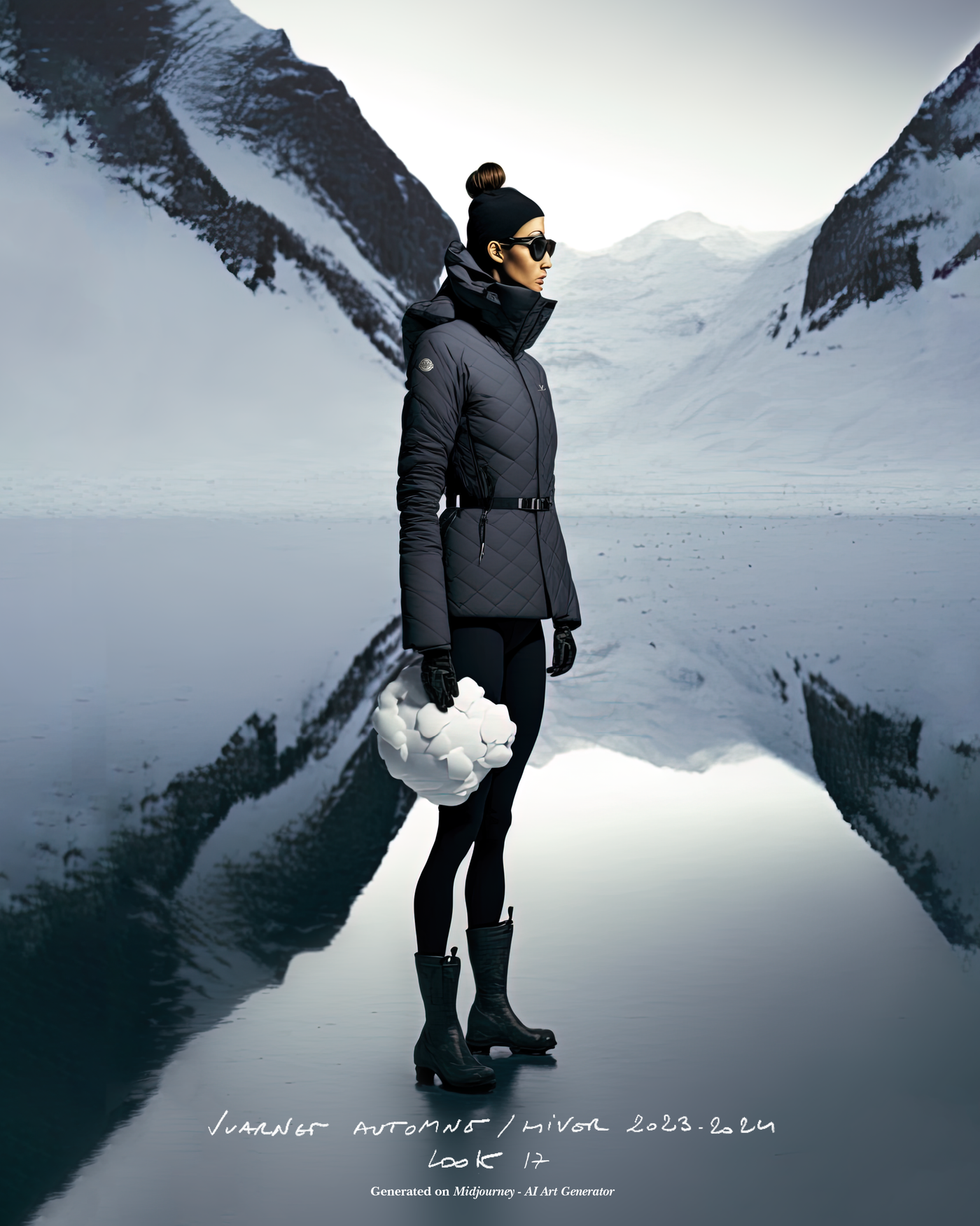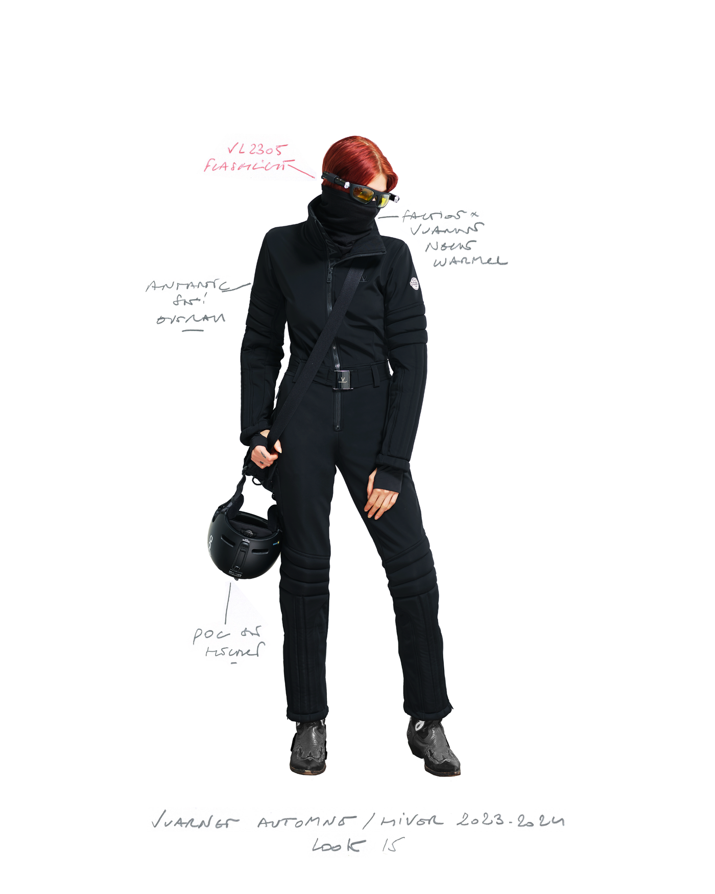 "Pour la saison Automne Hiver 2023, j'ai voulu rendre hommage à ce que représentait Jean Vuarnet à travers une dualité, en mélangeant des silhouettes et des vêtements techniques, avec des tricots et des vêtements alpins artisanaux et fabriqués en France", explique Boramy Viguier. Le lookbook lui-même illustre également une certaine dualité, avec deux images contrastées par look : une photo analogique centrée sur le vêtement, sans environnement ni fantaisie, qui fait face à une interprétation générée par un IA de la même image dans un environnement "naturel".